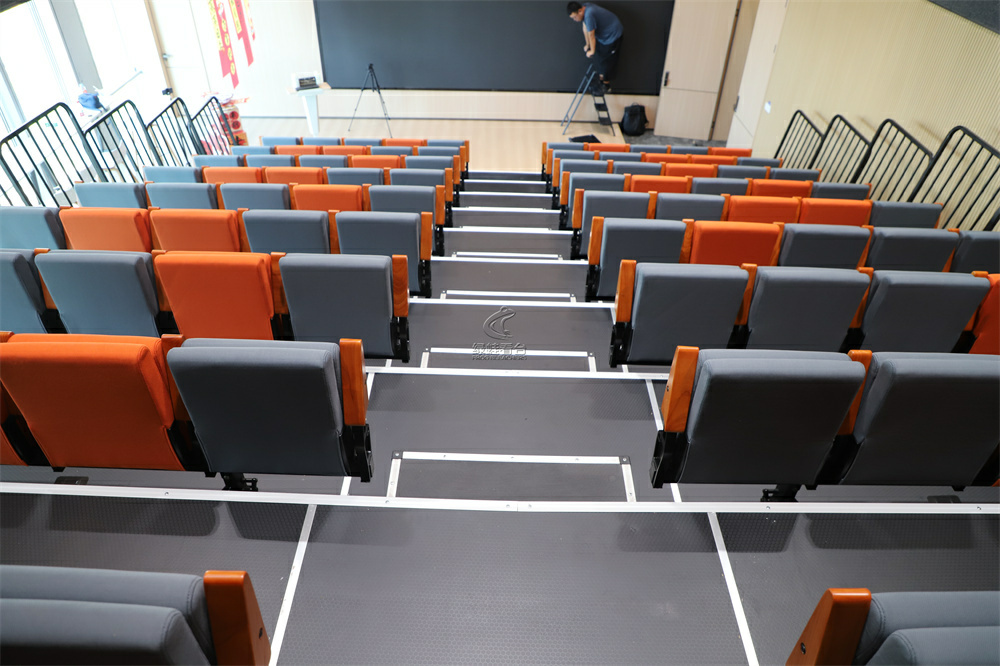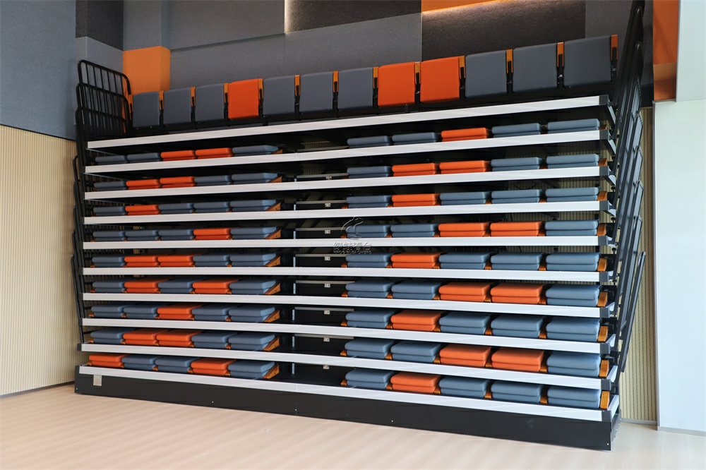 伸縮看臺(tái)整體為10層,電動(dòng),配置后置式軟包座椅,顏色搭配選擇灰和橙色,與室內(nèi)的吸音墻顏色高度協(xié)調(diào)。